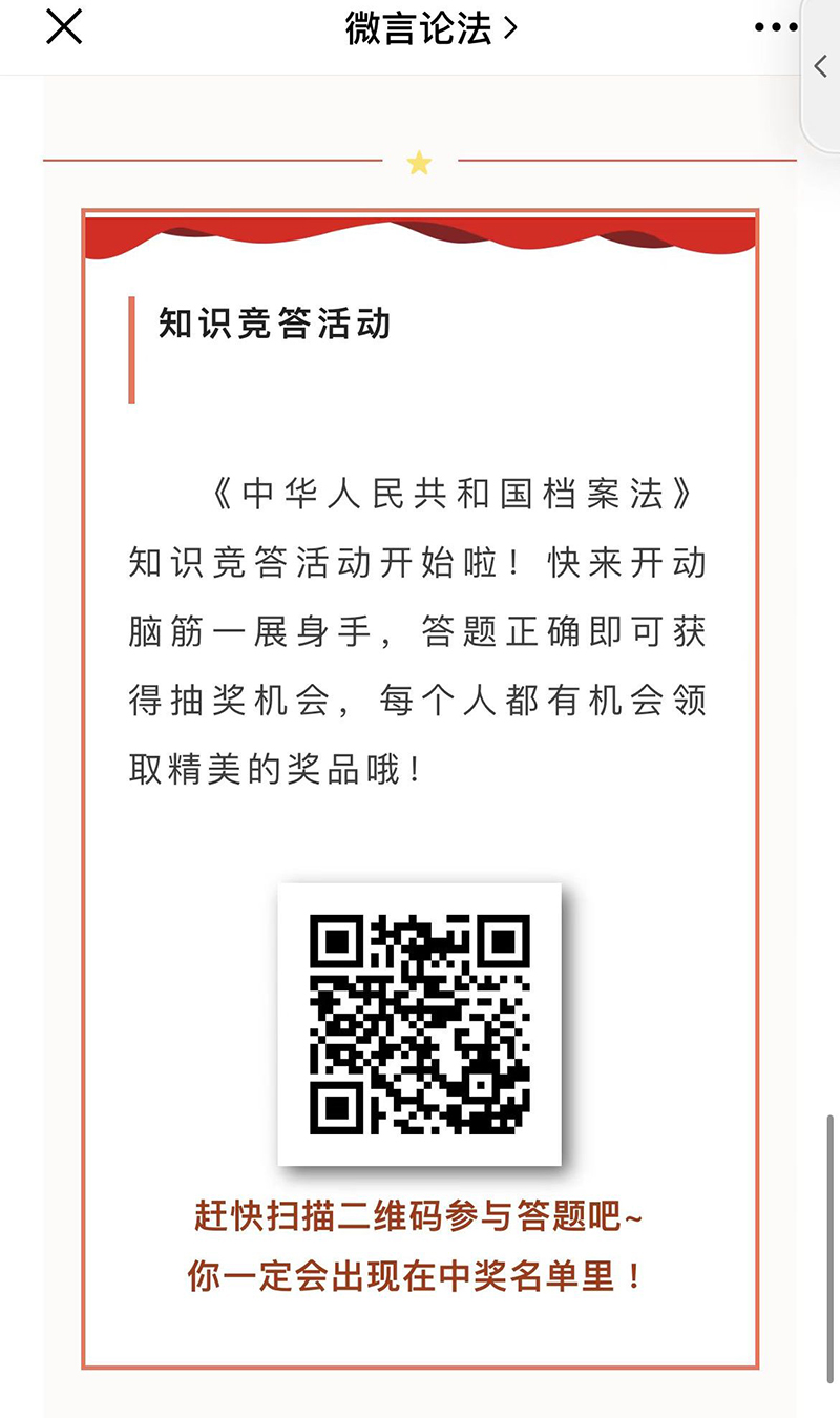 趣味竞答,普法增信。5月16日,在全校范围内开展《中华人民共和国档案法》知识有奖竞答,近500名师生积极参与,掀起答题热潮,师生们在知识性、趣味性的竞答中拓展档案知识,增强档案意识。
