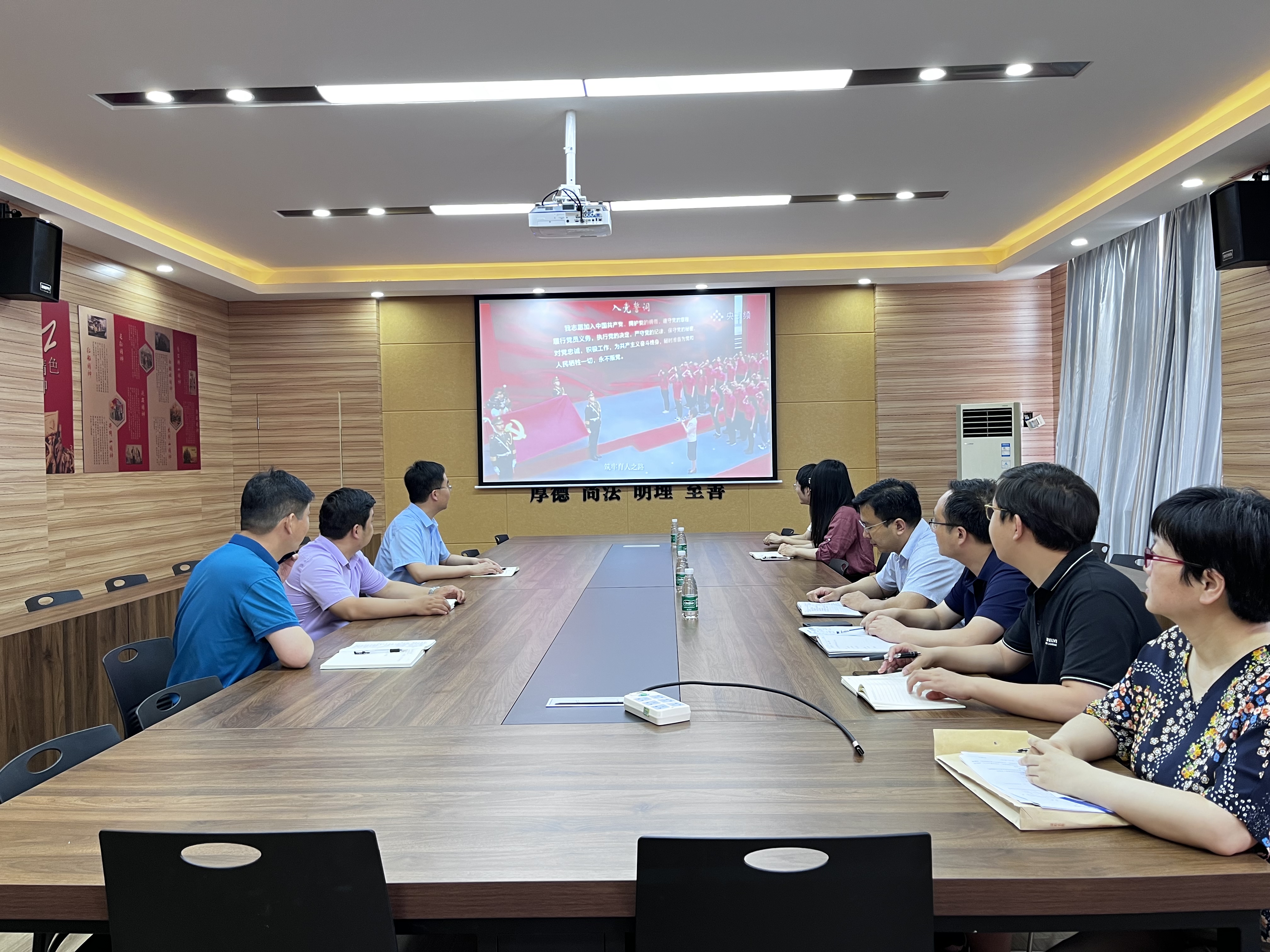 领导班子成员、党支部书记和部分教师在3424会议室重温入党誓词。在鲜红的党旗下,全体党员高举右手,在足球博彩网站
