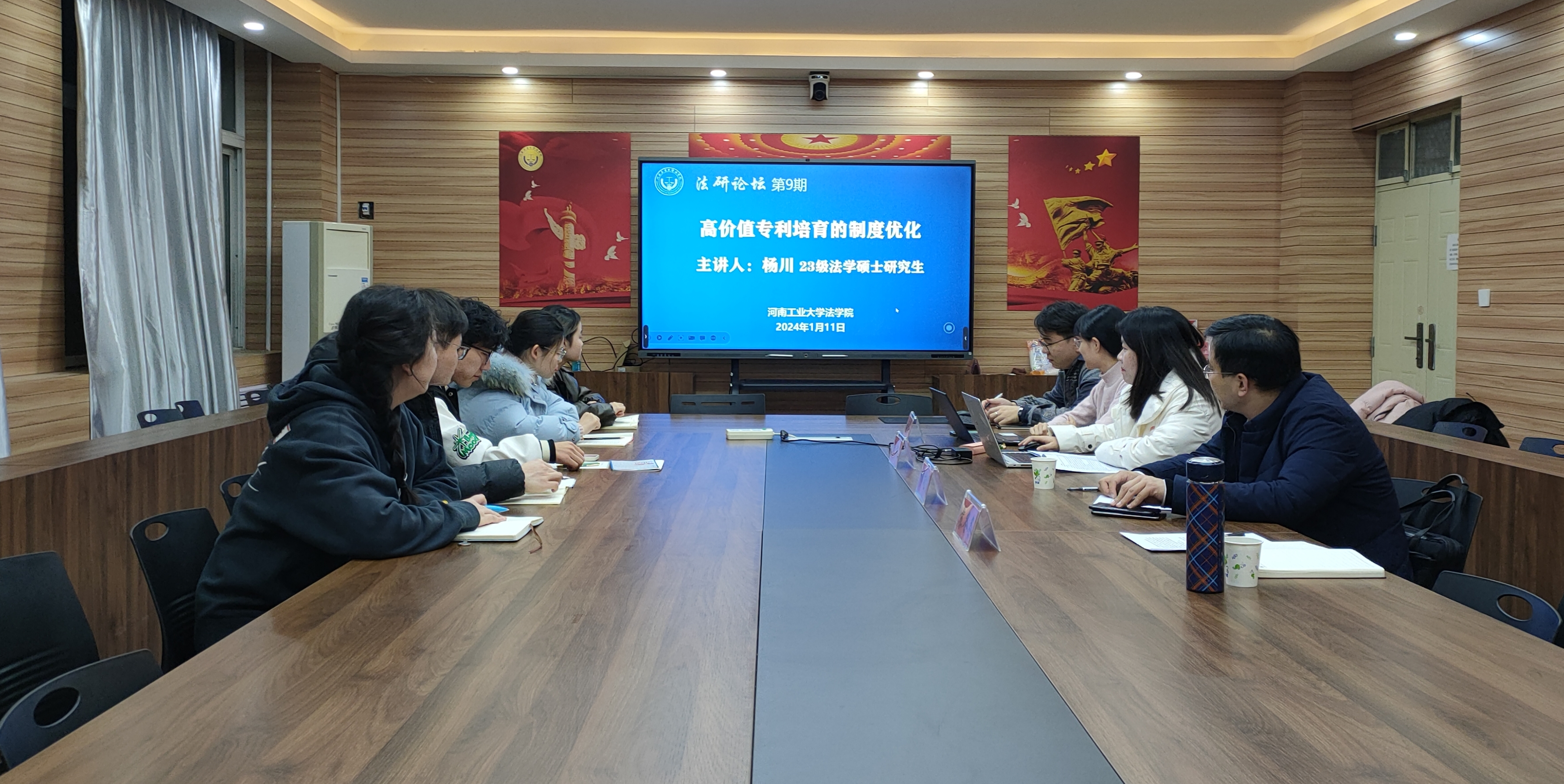 学科科研与研究生办公室主任苏冬冬博士担任评议人、硕士生导师穆向明副教授担任总结人。2023级法学硕士研究生杨川围绕“河南省高价值专利培育的制度优化”作主题分享。2023级全体法学硕士研究生参加会议。会议由2023级法学硕士研究生李莞玓主持。