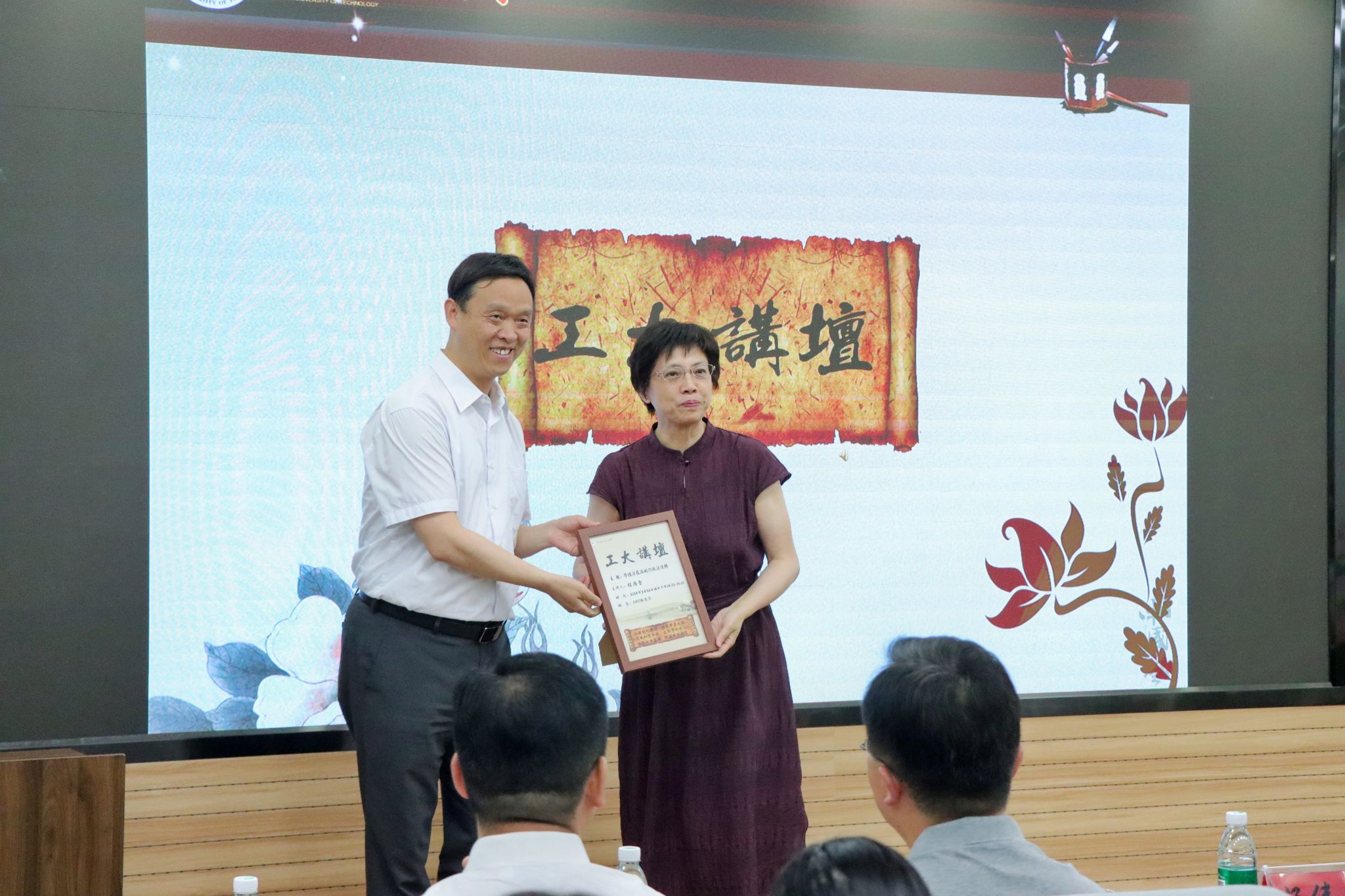 文化育人的成果,认为长廊浓缩法治文明之光,彰显传统文化之精髓。报告会伊始,黄泽峰向程雁雷表达了热烈的欢迎和诚挚的谢意,向与会者隆重介绍了程雁雷教授的基本情况,并赠送工大讲坛纪念海报。