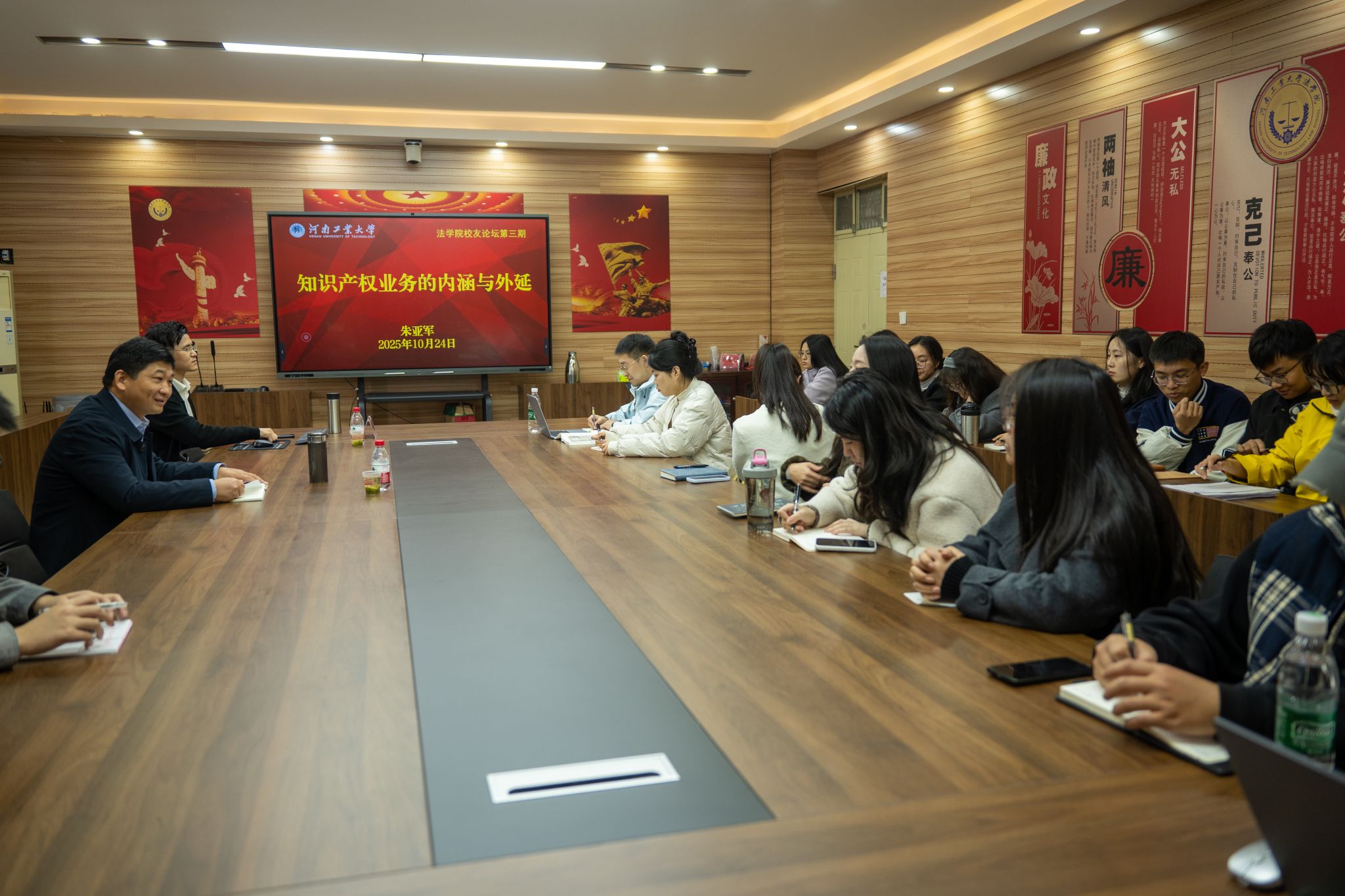 报告会赢得大家热烈掌声和内心共鸣。许文对朱亚军校友返校作报告表示感谢。朱亚军校友长期深耕知识产权业务,这次用专业反哺母校,是“有情怀的法律人”的典型代表,他的分享专业、详尽、务实,为研究生做好职业规划提供了有益参考。