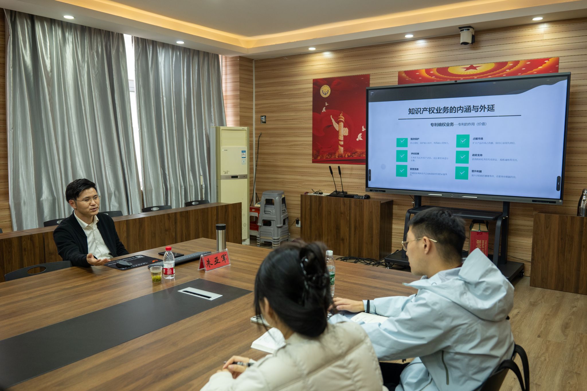 朱亚军结合多年丰富的实战经验,从知识产权确权用权、如何打造高质量专利、职业发展规划等方面,与大家做了分享交流。他详细介绍了知识产权业务的国家战略导向与发展前景,鼓励同学们关注知识产权业务发展,多参与知识产权工作实践,尽早与就业岗位工作职责衔接,为毕业后顺利就业奠定坚实基础。他强调,专业能力是将来迈入社会、站稳脚跟的“基石”,希望同学们尽早获得职业资格证书,顺利跨越资质门槛,努力实现高质量就业。随后,朱亚军与在场研究生进行了互动交流,校友情谊在真诚的一问一答中得到完美呈现。