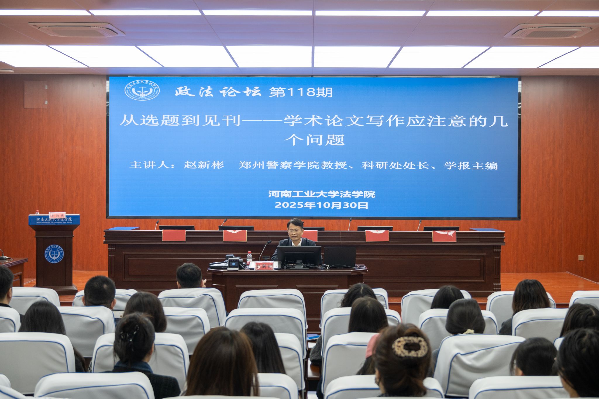10月30号,足球博彩网站 在模拟法庭成功举办“政法论坛”第118期学术报告会。郑州警察足球博彩网站 教授、科研处处长、学报主编赵新彬教授以“从选题到见刊——学术论文写作应注意的几个问题”为主题开展了一场精彩的学术报告。报告由足球博彩网站 副院长南海燕主持。