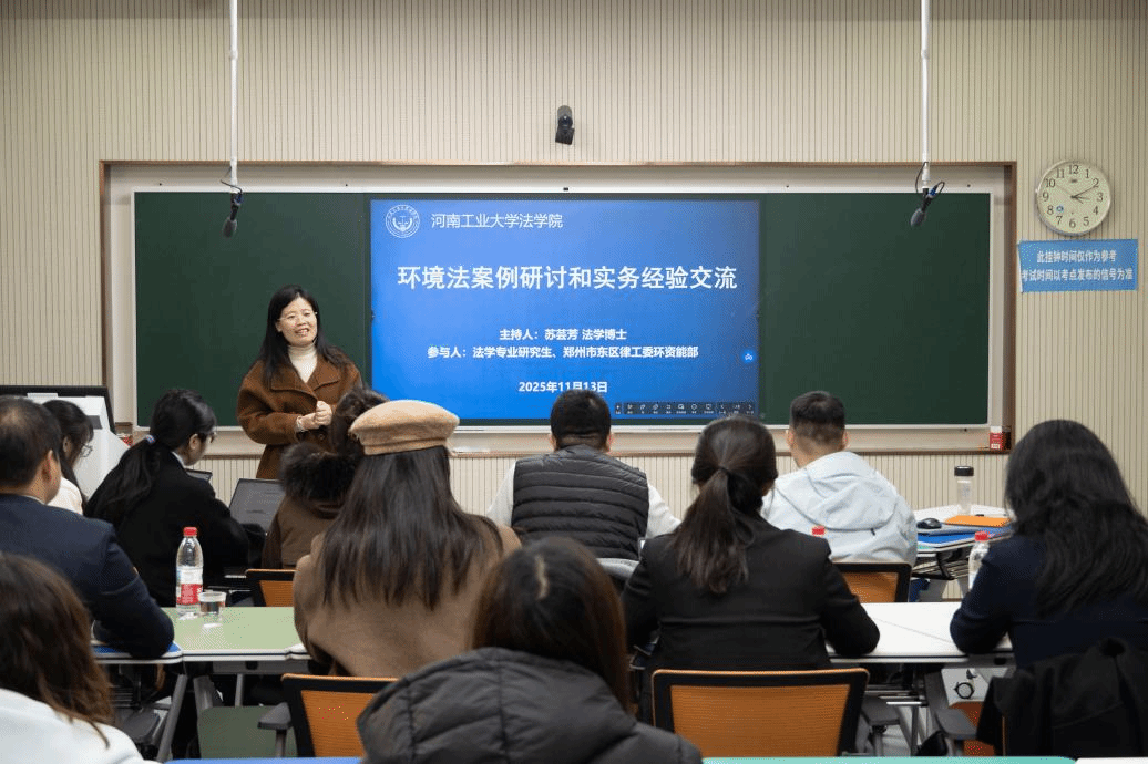 为落实《关于加强新时代法学教育和法学理论研究的意见》要求,通过真实案例研习推动法学教育改革创新,11月13日下午,郑东新区律工委环境资源与能源专业部走进我院研究生环境资源法课堂,开展了一场围绕某环境法案例进行环境法理论学习和实务经验深度交流的研讨会。本次活动由经济法与粮食法教研室苏芸芳博士主持,郑东新区律工委环资能专业部部长张晓吉、副部长谢雅琳,执委黄晖及相关委员代表和2024级全体法学硕士生参与。