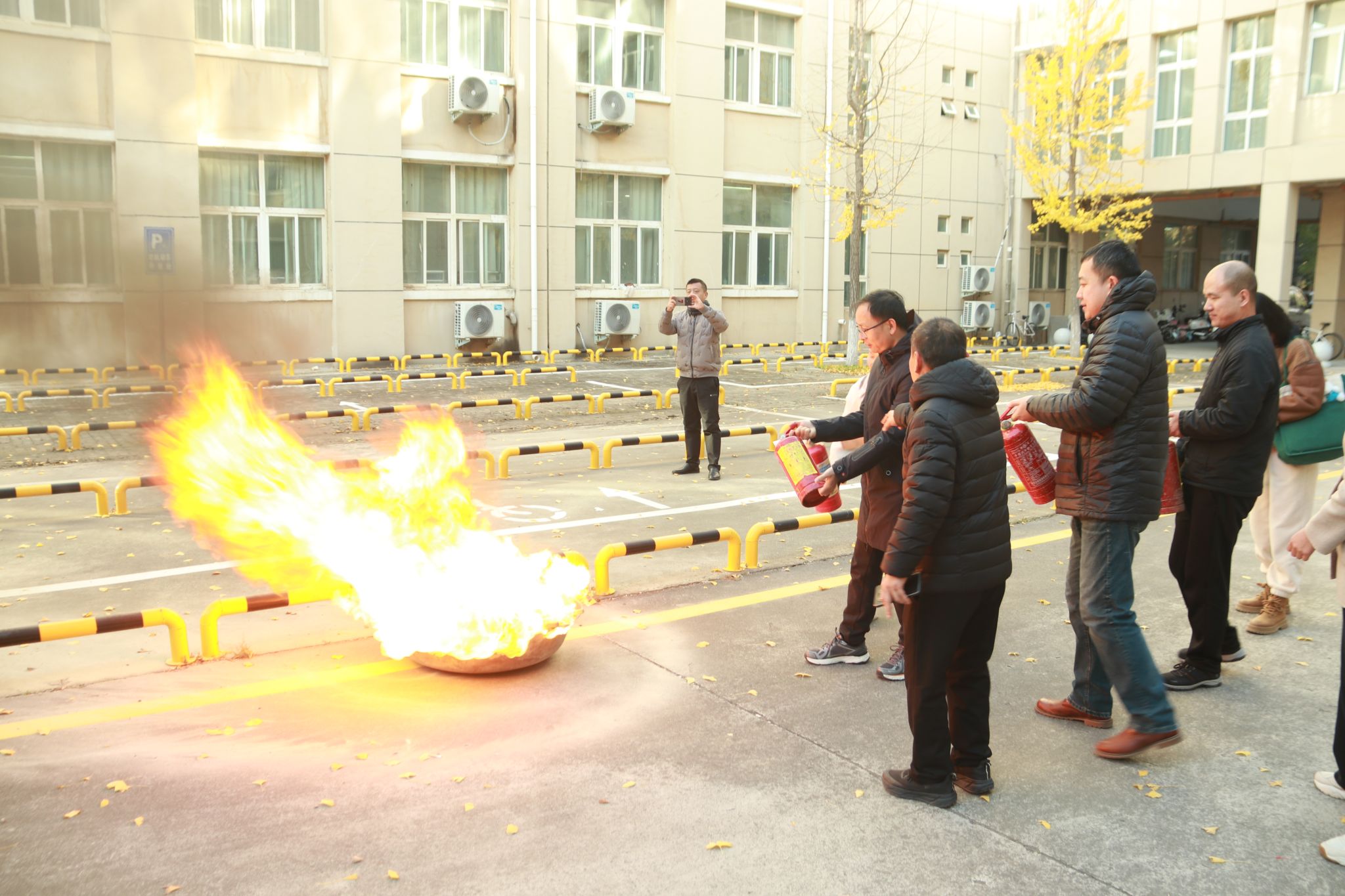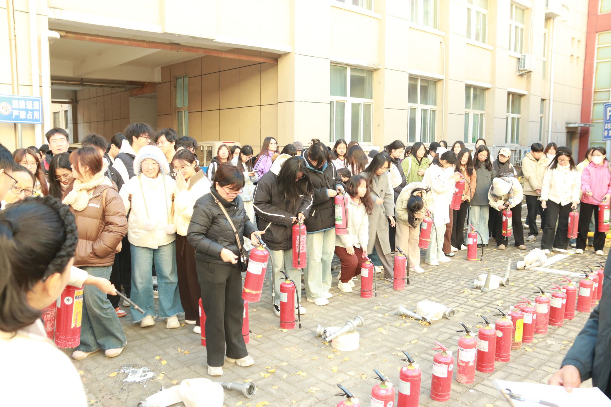 讲座结束后,消防安全实操演练在室外安全地带有序开展。孙志华首先现场演示了灭火器,消防水带的正确使用方法,之后在师生分组实操演练过程中,多次强调了灭火器“提、拔、握、压”的使用步骤及消防水带的连接方式,并对参与实操师生进行了逐一指导。