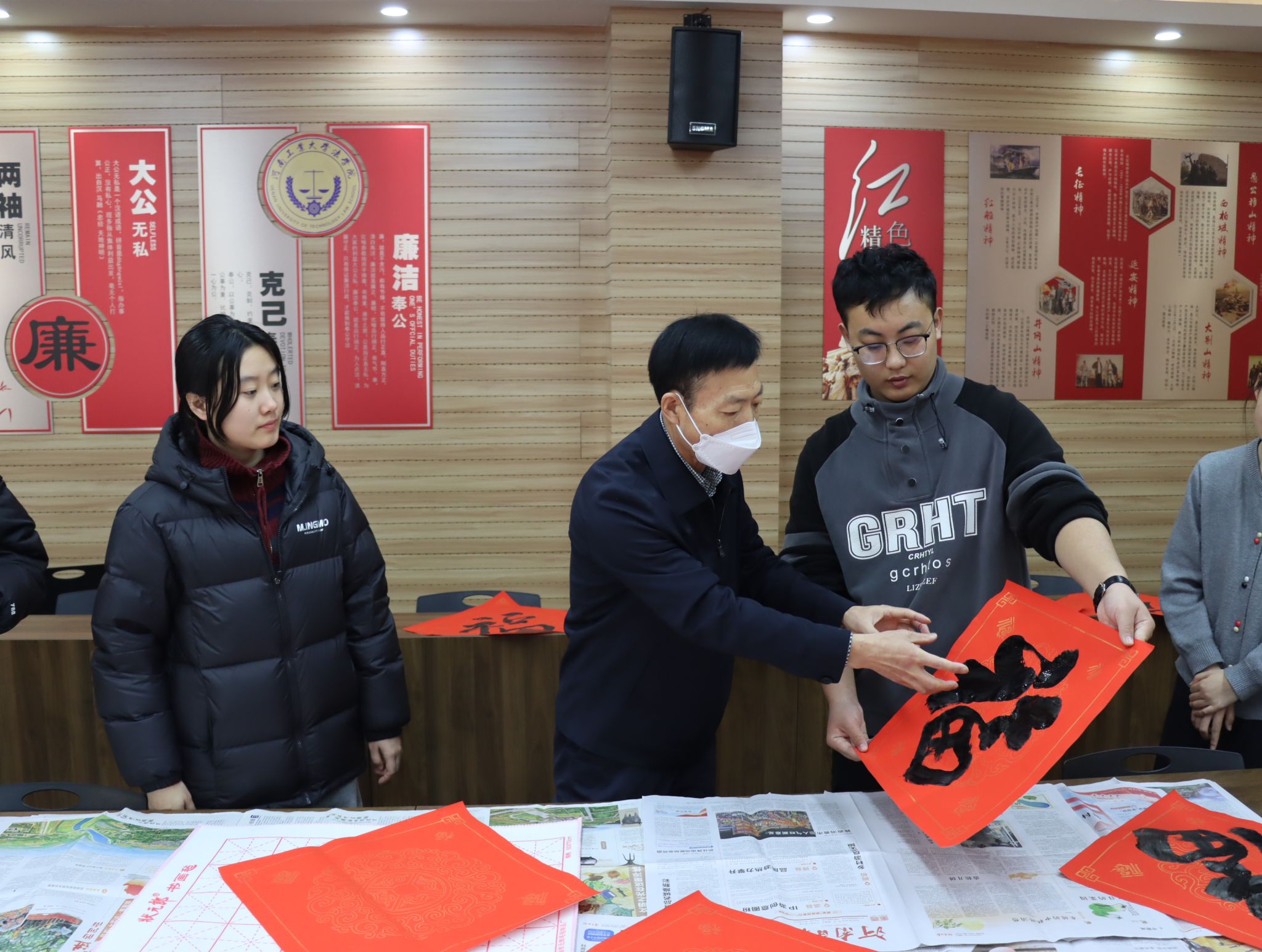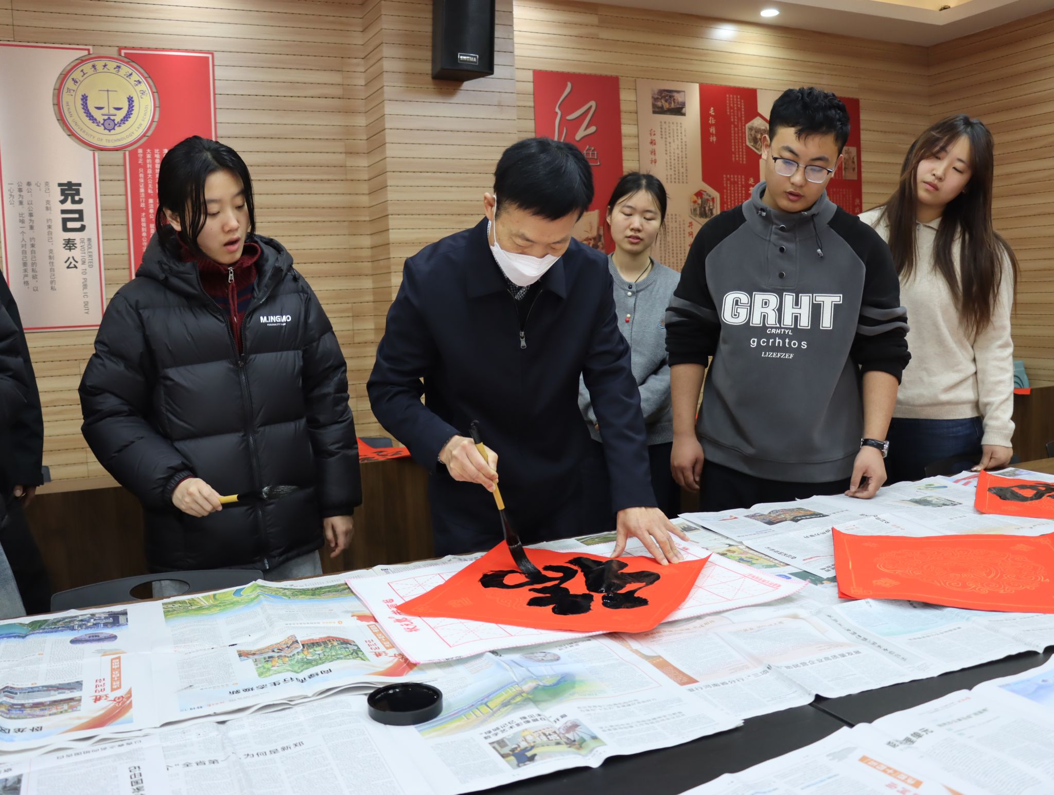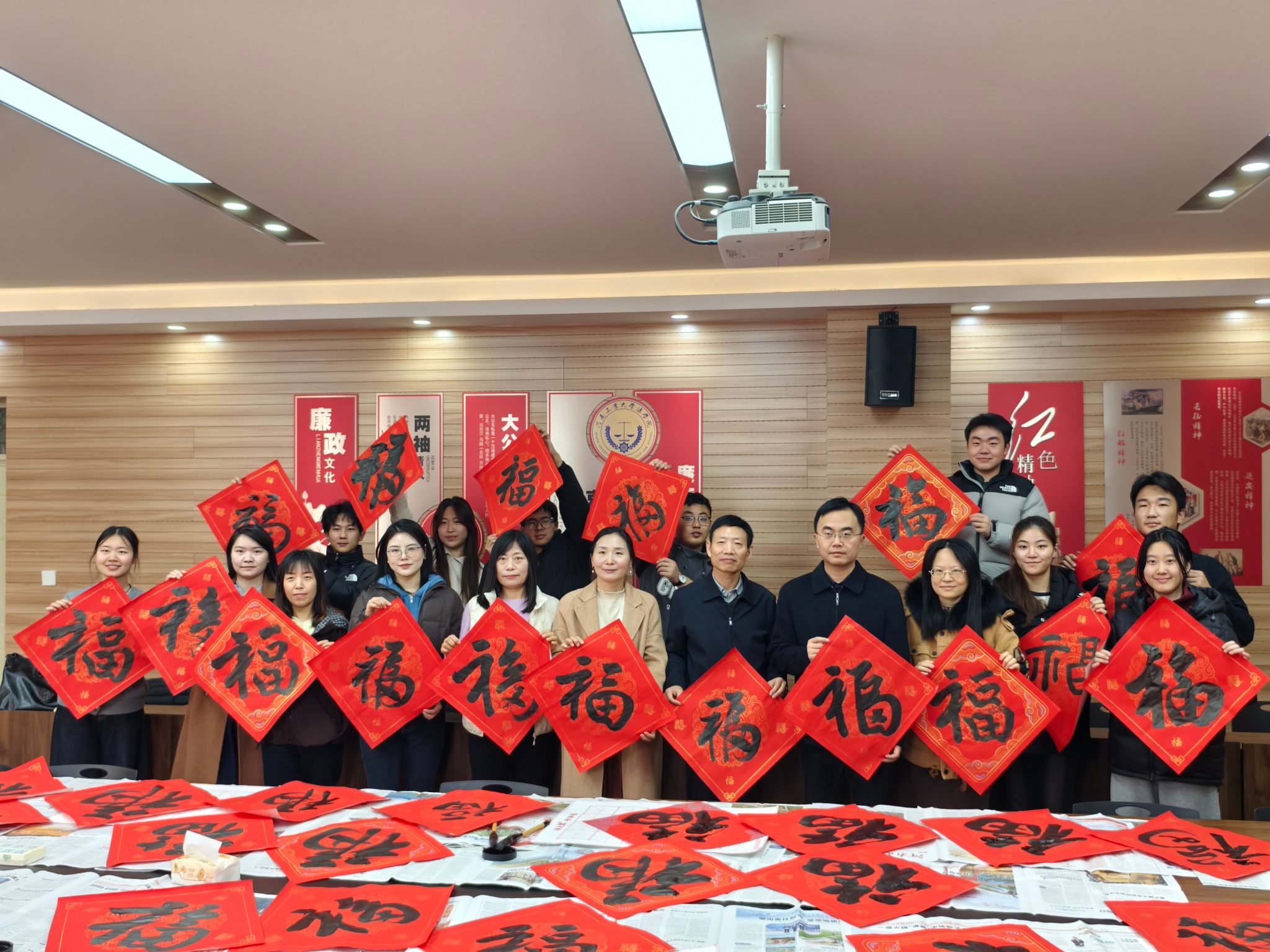 元旦佳节来临之际,为营造喜庆祥和的文化氛围,12月24日上午,足球博彩网站 关工委在博识楼3424会议室举办“挥毫写福送吉祥”活动。关工委常务副主任陈从志与青年学子以笔为媒、以墨传情,共同书写饱含祝福的“福”字,为全院师生送上最真挚的新年祈愿,让墨香与暖意弥漫冬日校园。