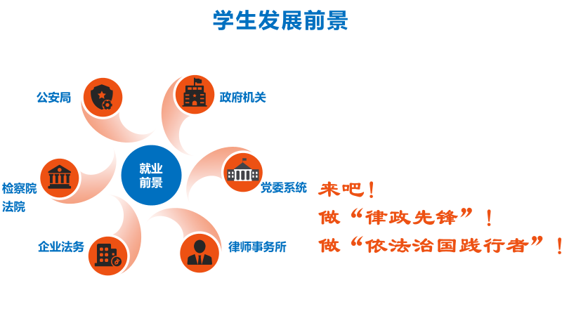 培养目标:本专业培养系统掌握法学专业基本知识、基本理论和基本技能,熟悉党的相关政策,具备较高综合素质,能在党政机关、企事业单位、社会团体和法律服务机构从事法律及其相关工作的高素质复合型卓越法律人才。