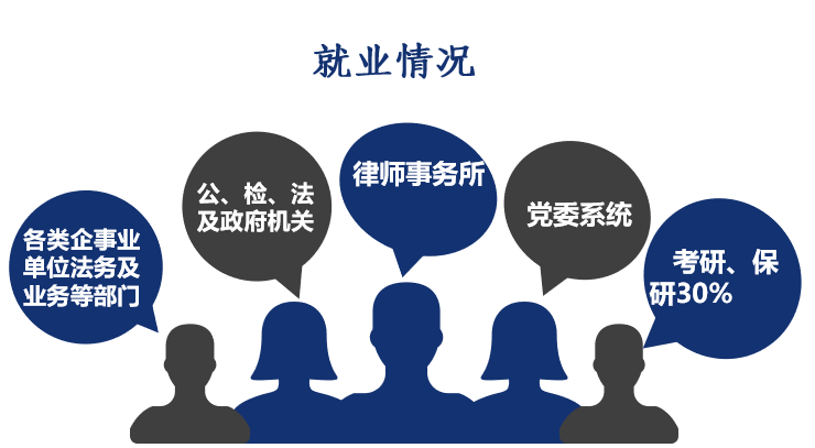 毕业生就业质量高。在校生司法考试通过率30%以上,考研率30%以上,名列省内前茅。考取研究生、公务员及事业单位的毕业生超过毕业生总人数的二分之一,毕业生广泛分布于公检法机构、党政机关、律师事务所、企事业单位法务部门等,深受用人单位好评。足球博彩网站