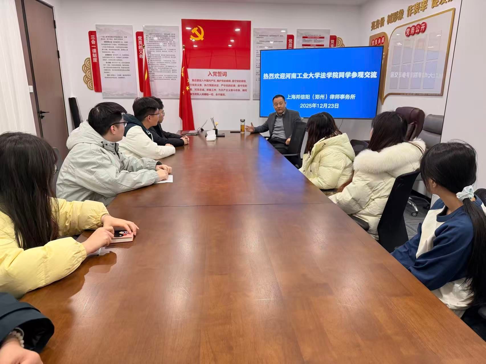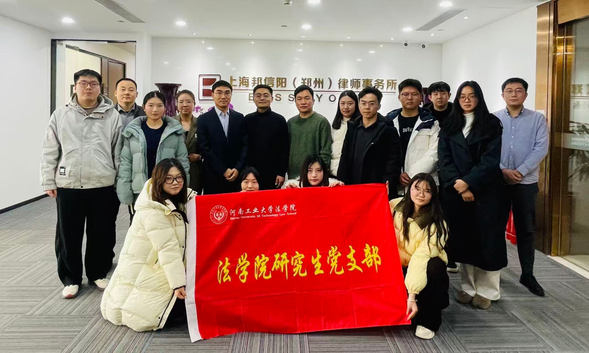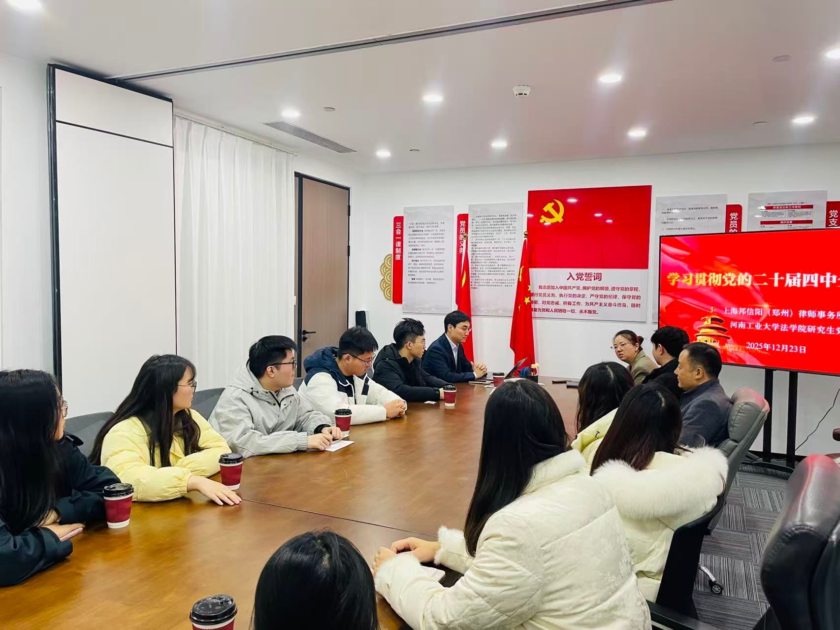 研究生党支部与上海邦信阳(郑州)律师事务所党支部共同举办“学习贯彻党的二十届四中全会精神”主题党日活动。活动在上海邦信阳(郑州)律师事务所会议室举行。研究生班主任、学科科研与研究生办公室主任陶泽飞、2025级研究生党员及学生代表,上海邦信阳(郑州)律师事务所党支部书记窦坤明与律所部分党员共同参加活动。