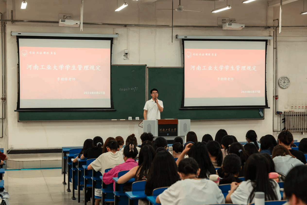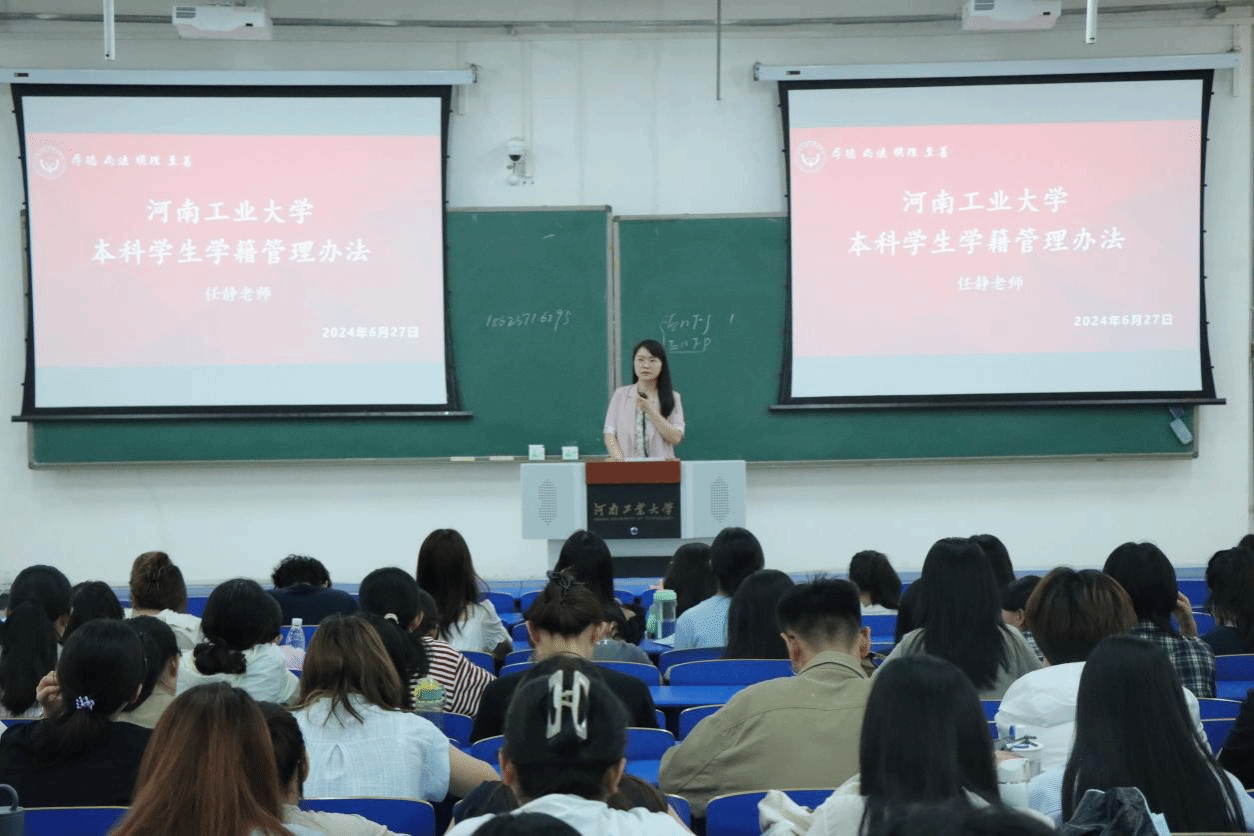 任静带领2023级学生学习了《河南工业大学本科学生学籍管理办法》。在培训会上,任静详细解读了学籍管理办法,特别强调了学习纪律、课程考核、成绩记载、休学与复学等关键环节的管理规定。此外,任静结合具体案例,介绍了一些特殊情形下的处理方式,如因病保留入学资格、缓考申请等,让学生对学籍管理的灵活性有了更深的认识。