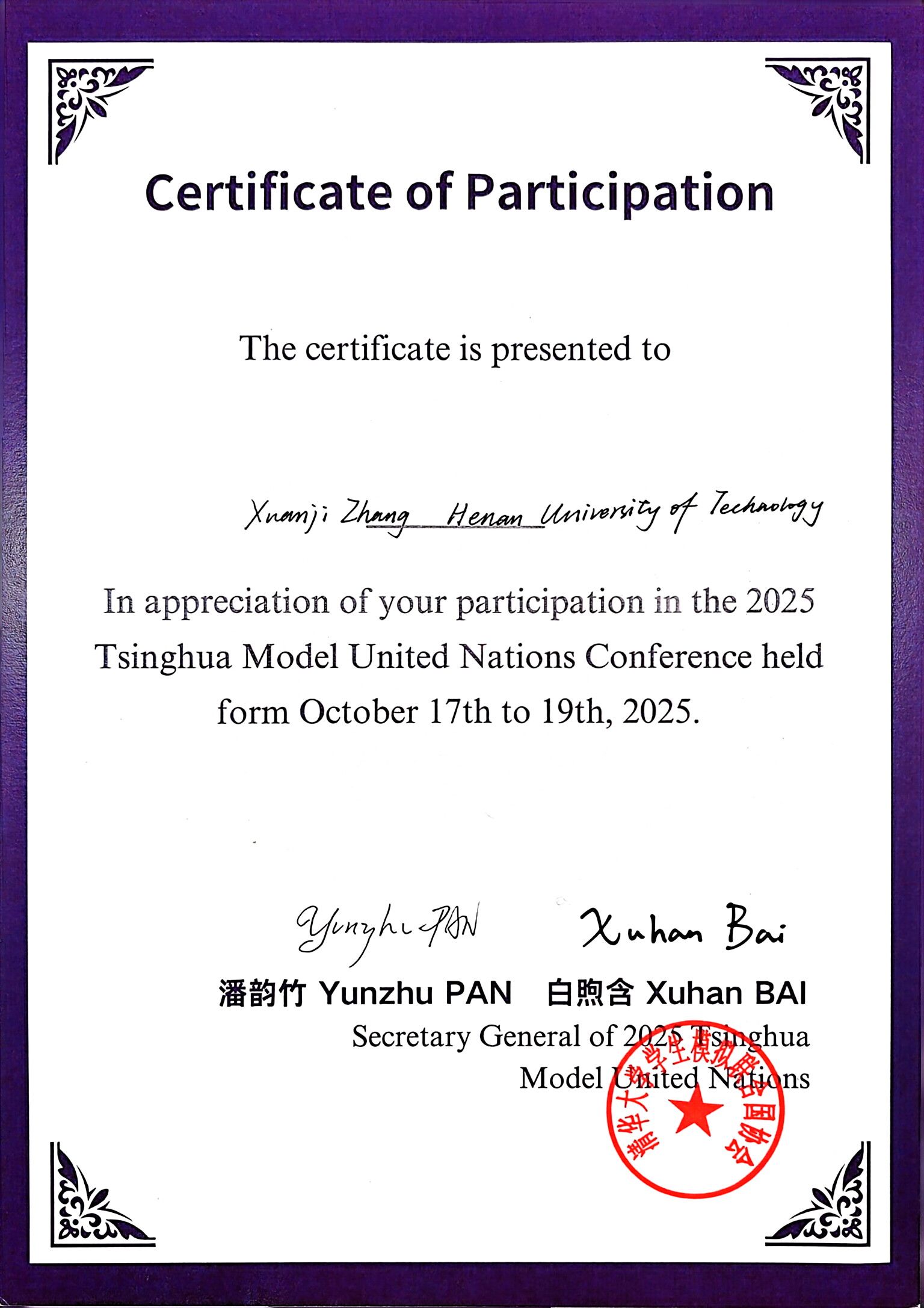 为庆祝联合国成立八十周年,2025年10月17日,紫荆模拟联合国会议在清华大学开幕。足球博彩网站 2023级学生张轩基代表我校参加国际模拟外交实践活动。