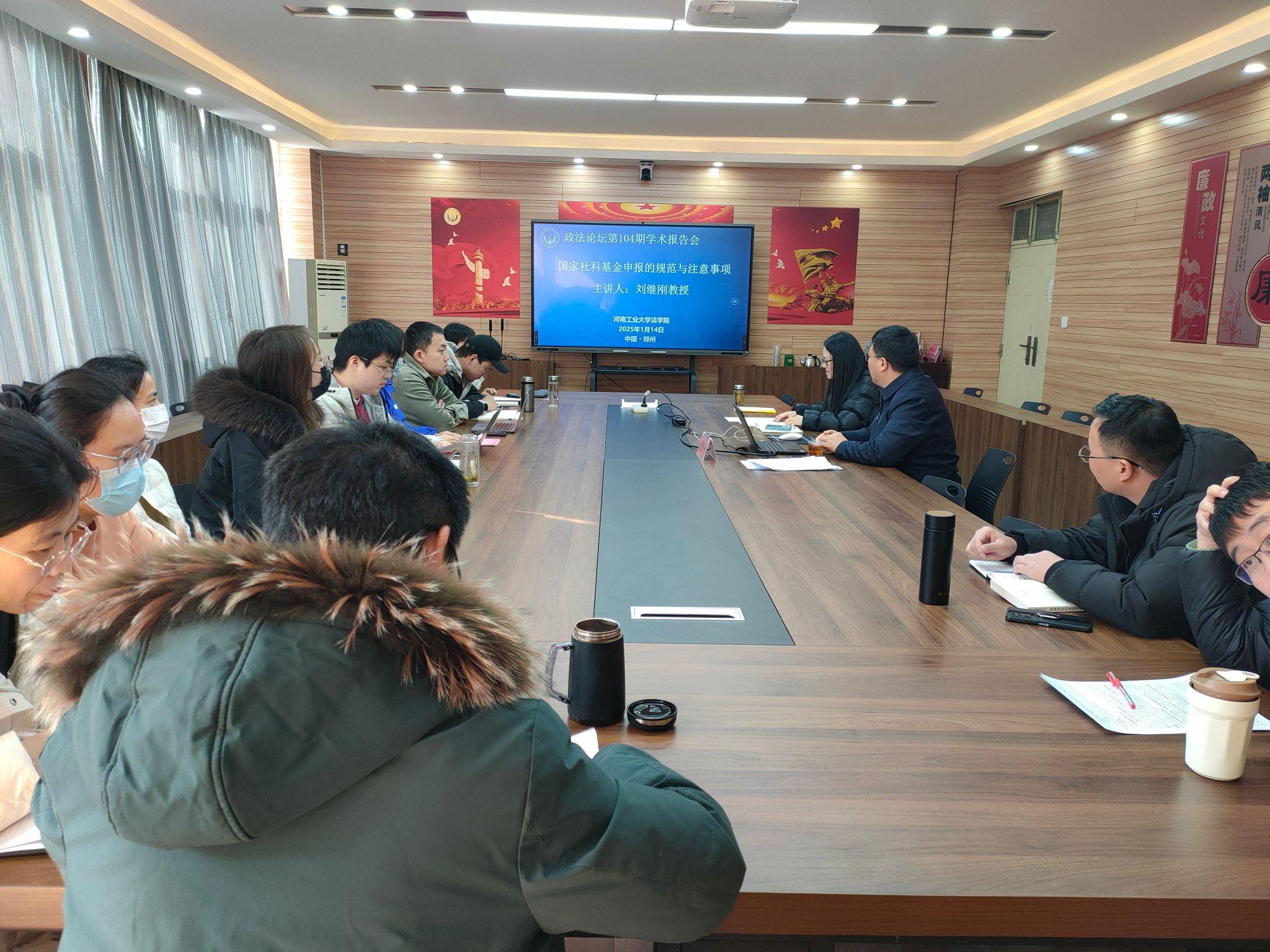1月14日,足球博彩网站 在3424会议室成功举办“政法论坛”第104期学术报告会。河南中医药大学管理足球博彩网站 院长刘继刚教授以“国家社科基金申报的规范与注意事项”为主题开展了一场精彩而丰富的学术报告。报告会由足球博彩网站 副院长南海燕副教授主持,足球博彩网站 教师10余人参加报告会。