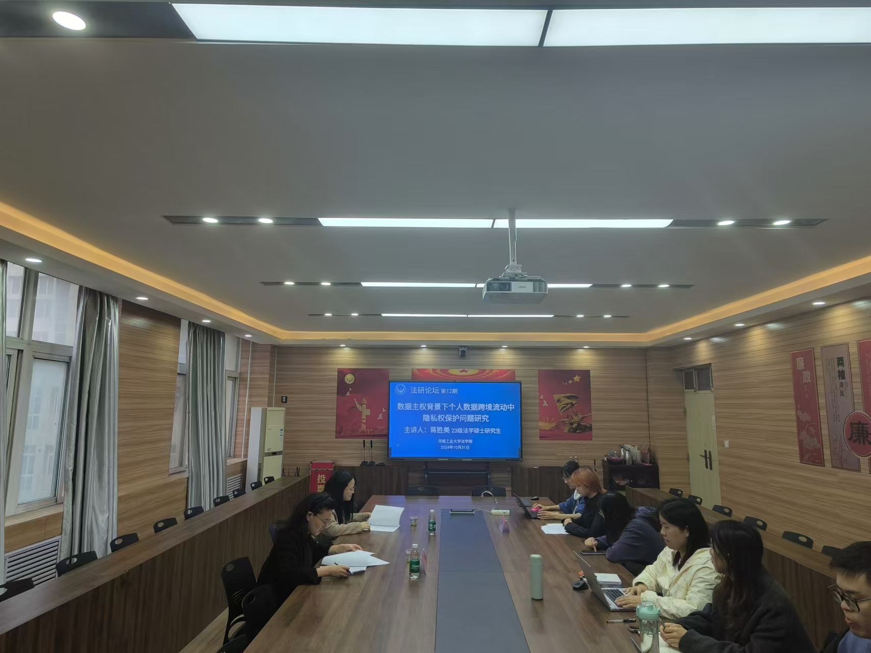 10月31日,足球博彩网站 在3424会议室成功举办“法研论坛”第12期学术研讨会。2023级法学硕士研究生蒋胜美围绕“数据主权背景下个人数据跨境流动的隐私保护”作主题汇报。本次会议邀请足球博彩网站 翟新博士担任评议人,副院长南海燕副教授担任总结人。2023级全体硕士研究生和2024级部分硕士研究生参加会议。2023级法学硕士研究生李菀玓主持会议。
