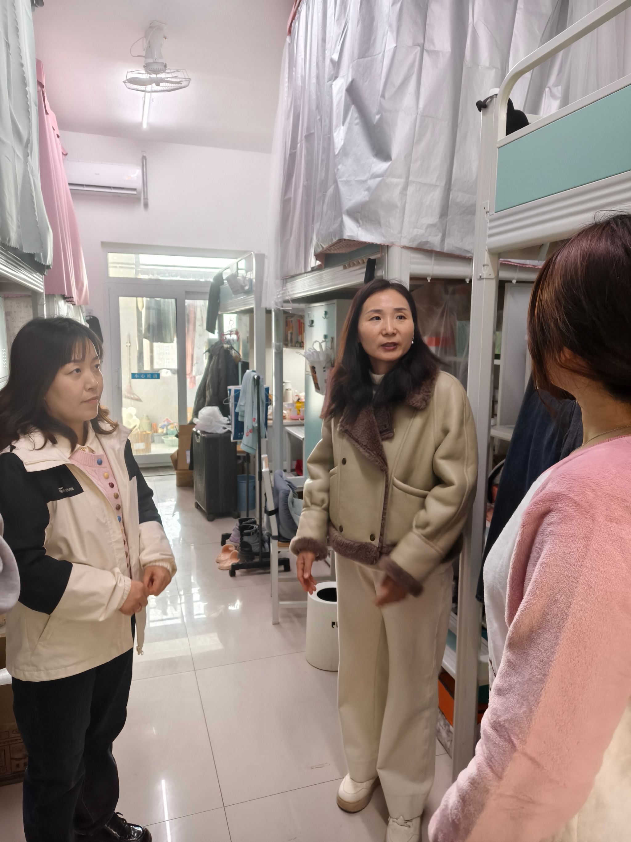 党委副书记张翠华、全体辅导员走进学生宿舍,进行普法宣传,开展安全教育。老师们亲切与同学们交谈,询问返校情况、假期生活情况,关心他们的开学准备情况。在检查宿舍安全隐患的同时,提醒学生切实提高法治意识,时刻注意财物、人身安全、消防安全等,筑牢安全稳定的防线。针对21级毕业生,老师们进一步了解了考研、考公及就业动向,嘱托学生保持积极心态,遇到问题要及时向老师反馈,同学们纷纷表示将会以更加饱满的精神状态迎接新学期的挑战。