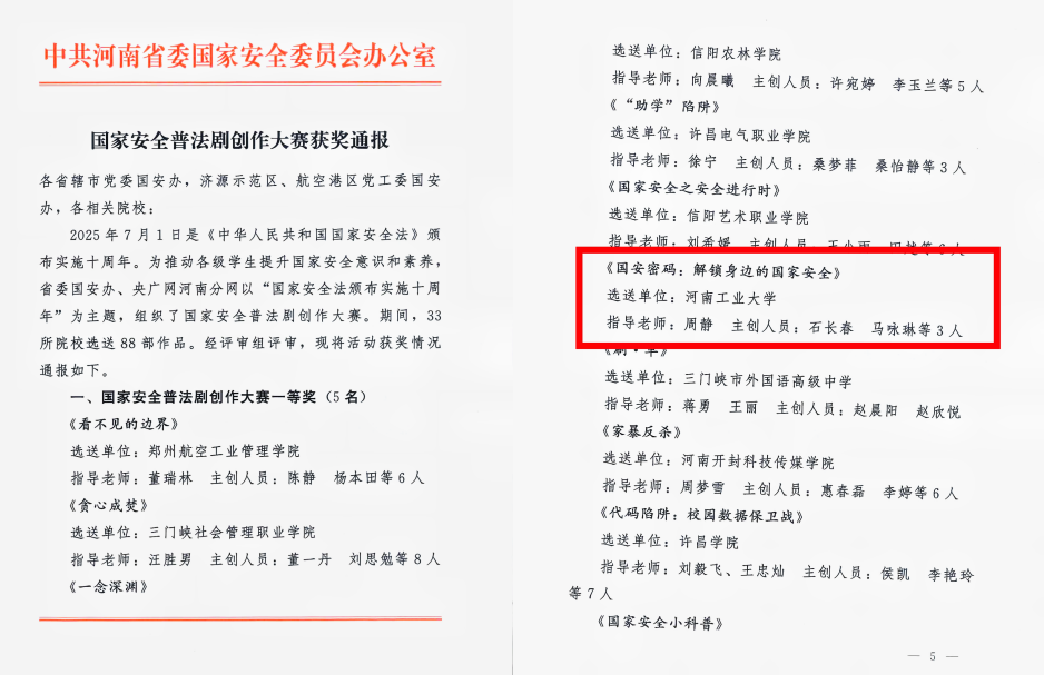 近日,中共河南省委国家安全委员会办公室公布了国家安全普法剧创作大赛获奖名单。经评审组评审,来自全省33所院校选送的88部作品中,足球博彩网站 普法剧作品《国安密码:解锁身边的国家安全》脱颖而出,荣获大赛三等奖。