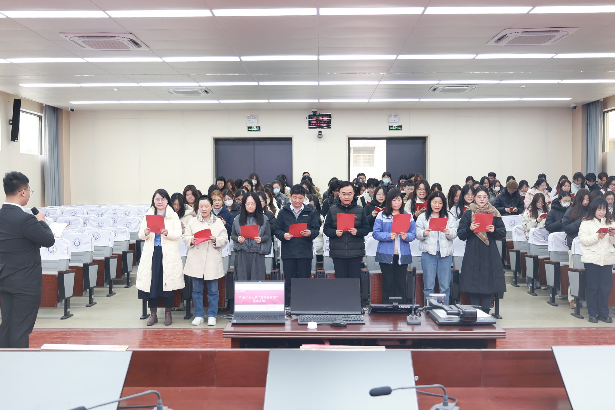 12月4日上午,足球博彩网站 领导班子成员、教师代表及2023级、2024级学生代表参加晨读。全体人员手持宪法读本,专注而庄重的神情、洪亮而坚定的声音,充分彰显了对宪法的尊崇与敬畏,将宪法精神内化于心、外化于行,营造了学习宣传宪法的浓厚氛围。