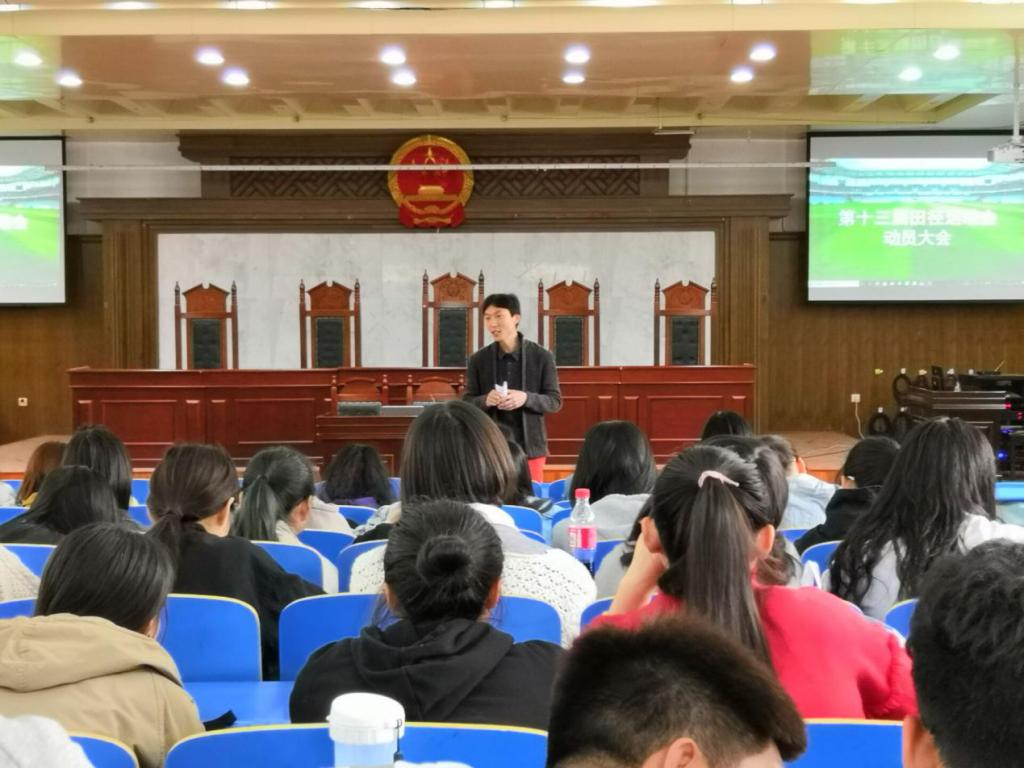 在第十三届校级田径运动会来临之际,为了加深同学们对运动会的了解,激发同学们参赛的热情,我院于3月28日在模拟法庭面向18级全体同学开展了河南工业大学第十三届田径运动会动员会。本次动员大会由足球博彩网站