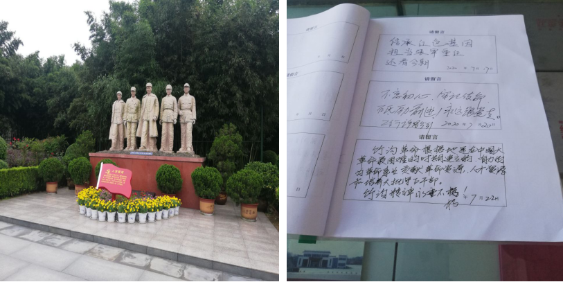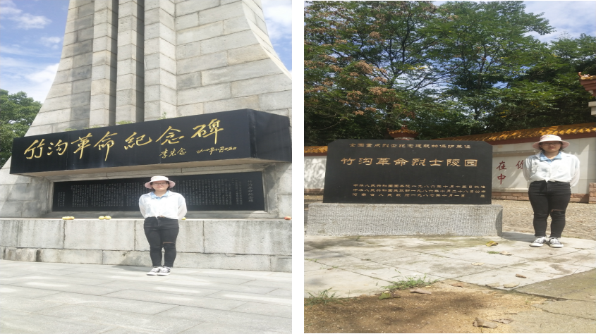 受到疫情的限制,2020年8月3日,探访参观竹沟烈士陵园的任务交给了追忆烽火岁月暑期实践小队的队员李紫薇同学。由她代表本小队去烈士陵园瞻仰为红色革命事业而献出自己生命的英雄们。在苍松翠柏的掩映下,竹沟革命烈士陵园更加庄重肃穆,竹沟革命纪念碑更显巍峨高大。一路上迈着沉痛的脚步,怀着沉重的心情,也能感觉身后是一个个英雄的鲜血和灵魂在默默守护着我们。