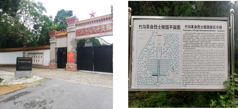 陵园大门是一座仿古牌楼式建筑," 竹沟革命烈士陵园 "园名是张爱萍将军亲笔题写的。陵园广场两侧建有东、西两个展厅。
