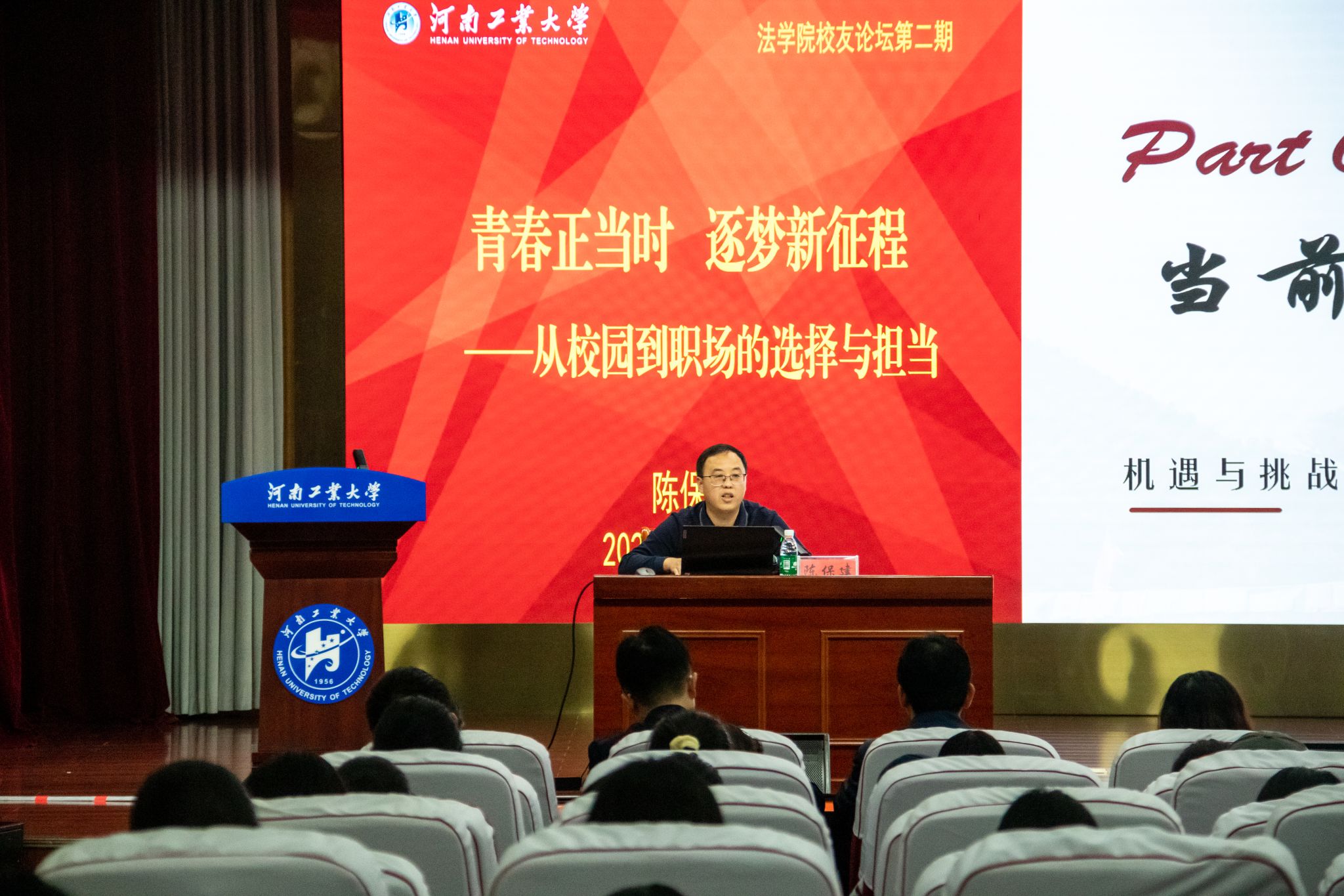 陈保建结合自身在西藏的成长经历,从当前大学生就业现状、西藏经济发展现状、西藏吸引人才的独特优势、给学弟学妹们的建议四个方面,做了一场饱含工大法学人家国情怀的深情报告。他详细介绍了西藏重要的战略定位、西藏壮丽的自然风光、西藏独特的民族文化、西藏广阔的发展空间、西藏优厚的政策待遇,鼓励同学们做“有情怀的法律人”,如果对西藏感兴趣,不妨大胆地迈出这一步,在这片高原热土上,发现不一样的自己,收获意想不到的成长和成功!